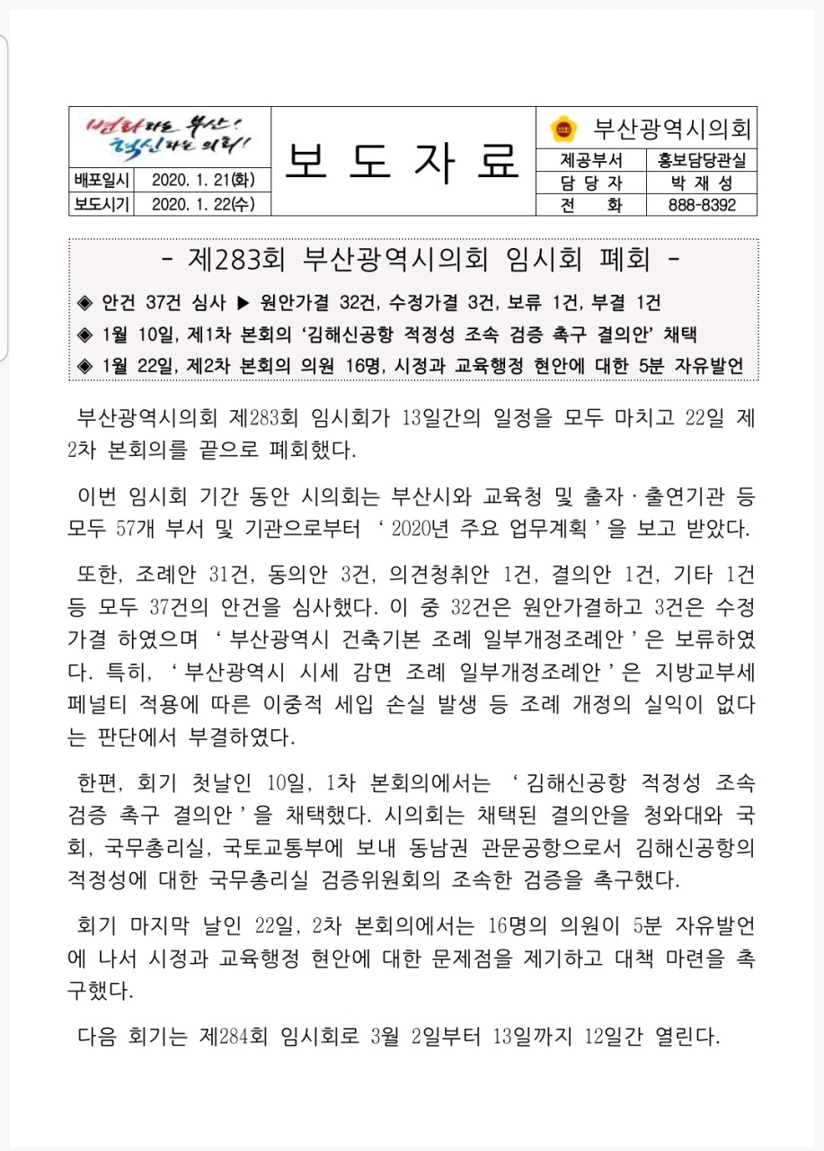 ¿À´Ã·Î¼ ºÎ»ê±¤¿ª½ÃÀÇȸ Á¦283ȸ ÀÓ½Ãȸ°¡ 13Àϰ£ÀÇ ÀÏÁ¤À» ¸ðµÎ ¸¶Ä¡°í 22ÀÏ Á¦2Â÷ º»È¸ÀǸ¦ ³¡À¸·Î ÆóȸÇÕ´Ï´Ù.