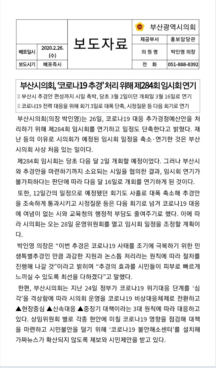 ºÎ»ê½ÃÀÇȸ, ¡®Äڷγª19 Ã߰桯ó¸® À§ÇØ Á¦284ȸ ÀÓ½Ãȸ ¿¬±â