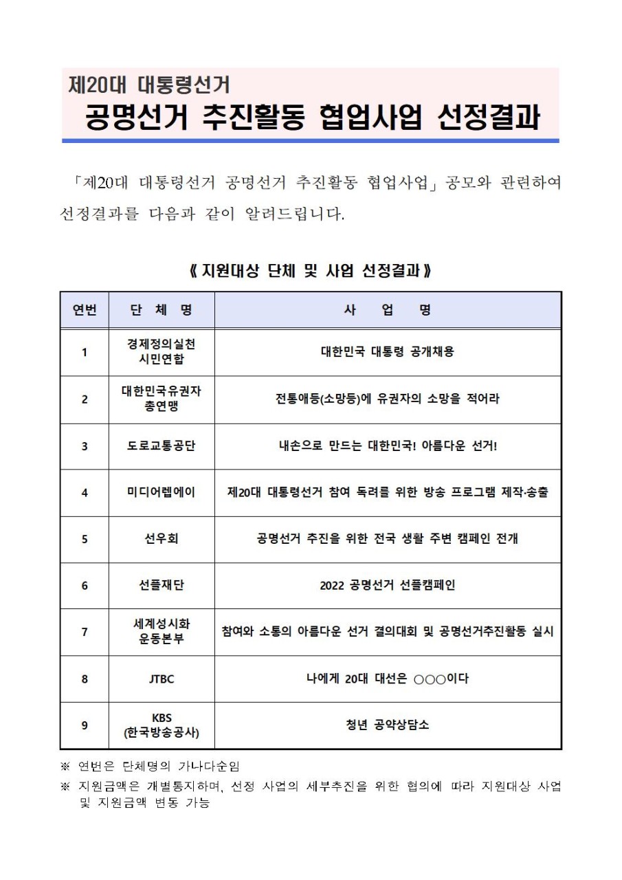 Á¦20´ë ´ëÅë·É¼±°Å °ø¸í¼±°ÅÃßÁøÈ°µ¿ Çù¾÷»ç¾÷ÀÚ ¼±Á¤